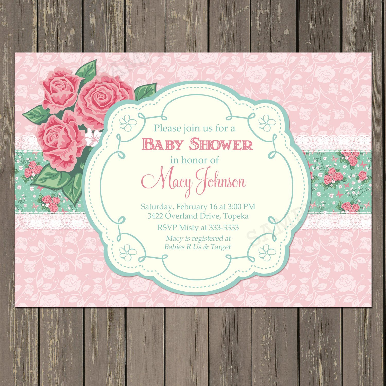 Baby Shower Invitation, Pink and Green rose themed baby shower invitations