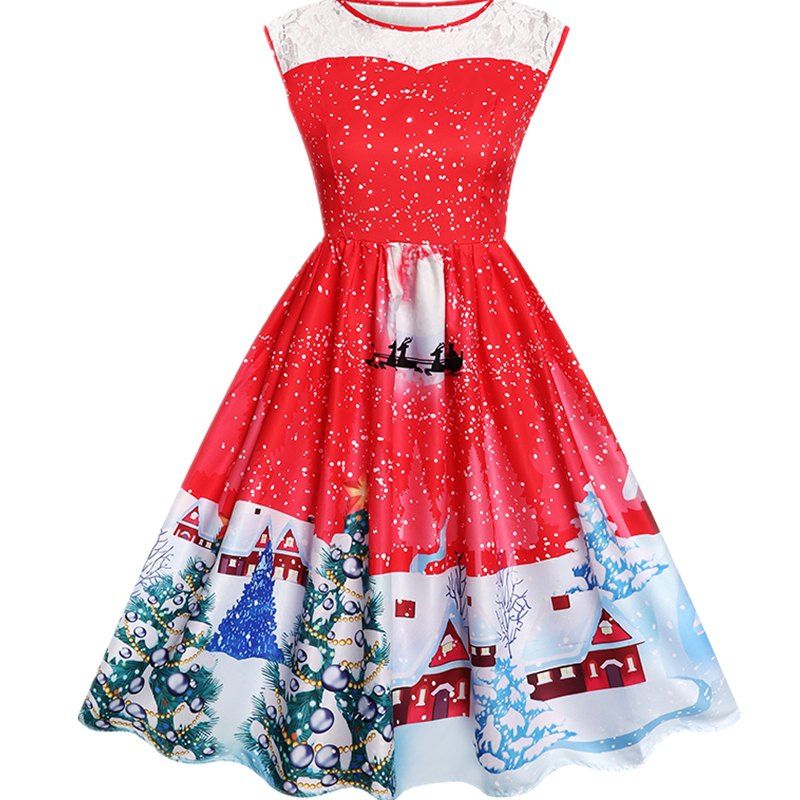 2020 Christmas Print Lace Stitching dresslily christmas dress