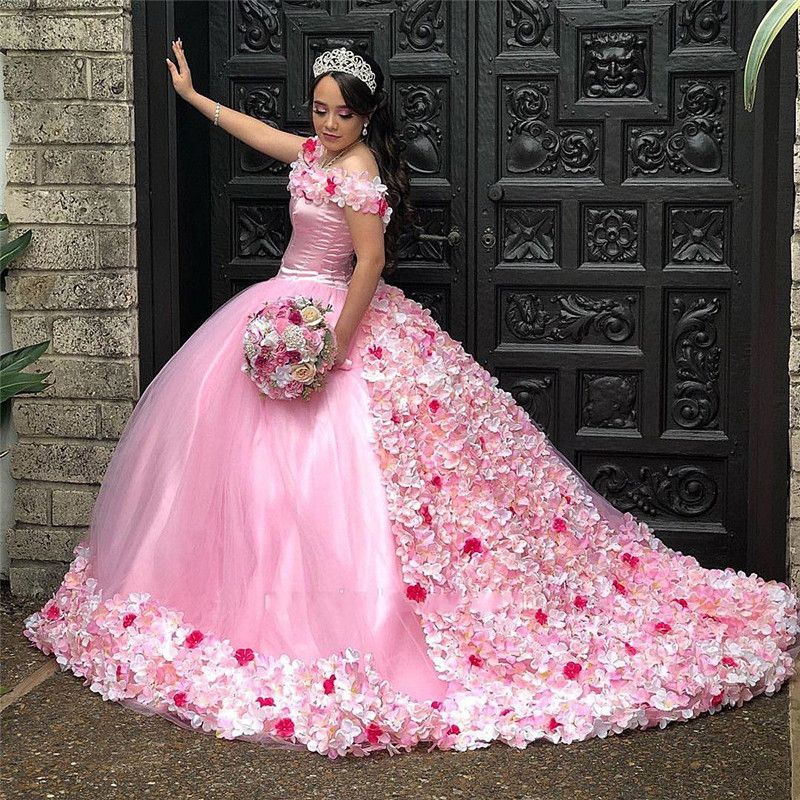 Charming Pink 3D Flower Quinceanera pink sweet 15 dresses