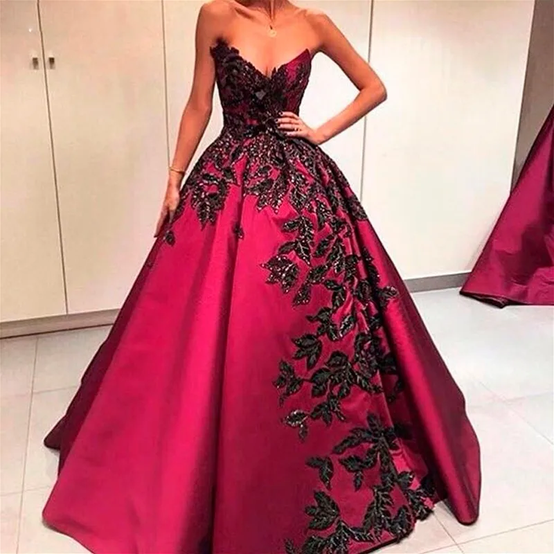Ball Gown Sweetheart Evening Dresses red gown with black lace