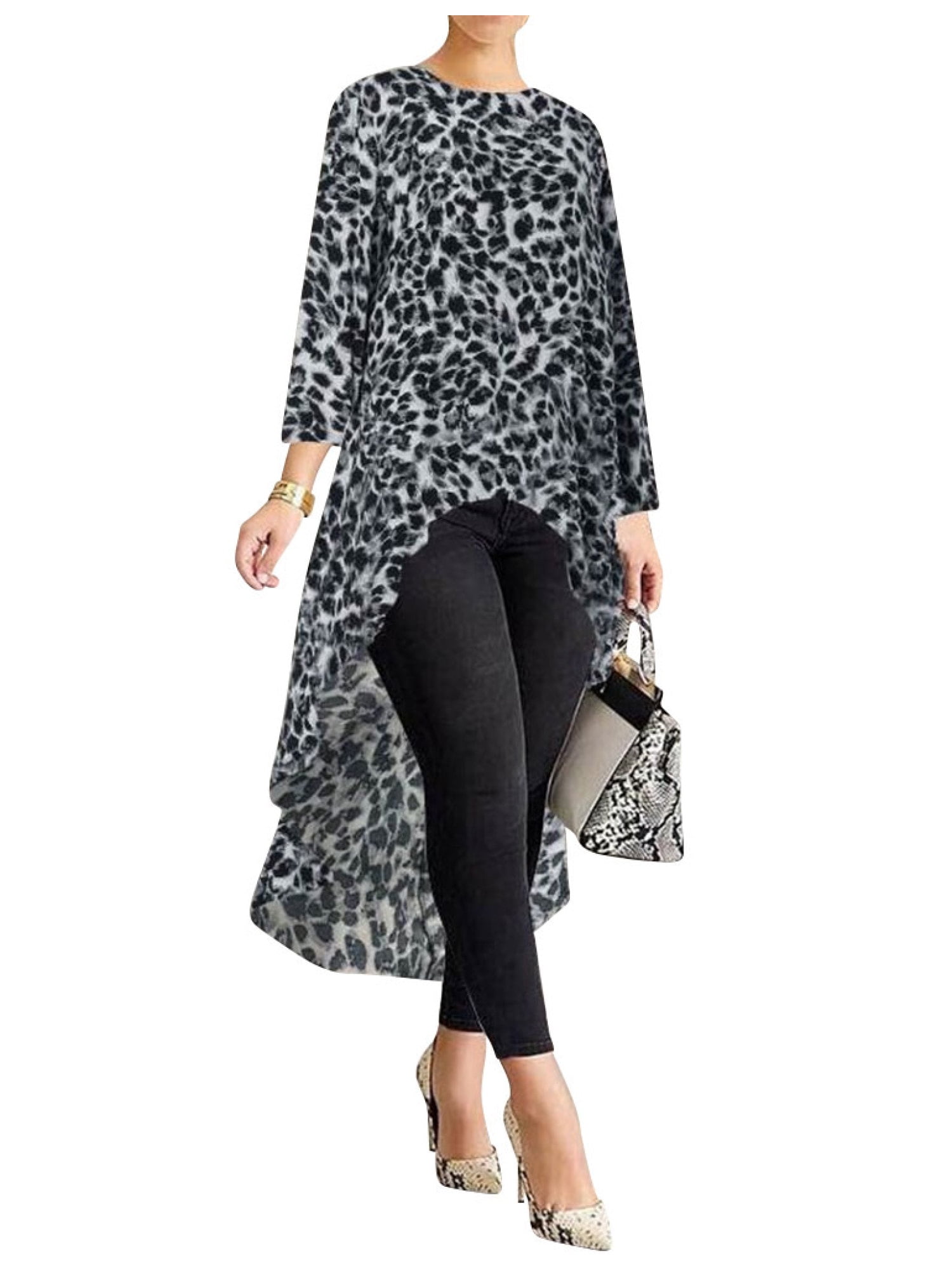 Low Irregular Hem Round Neck Mid-length leopard high low top