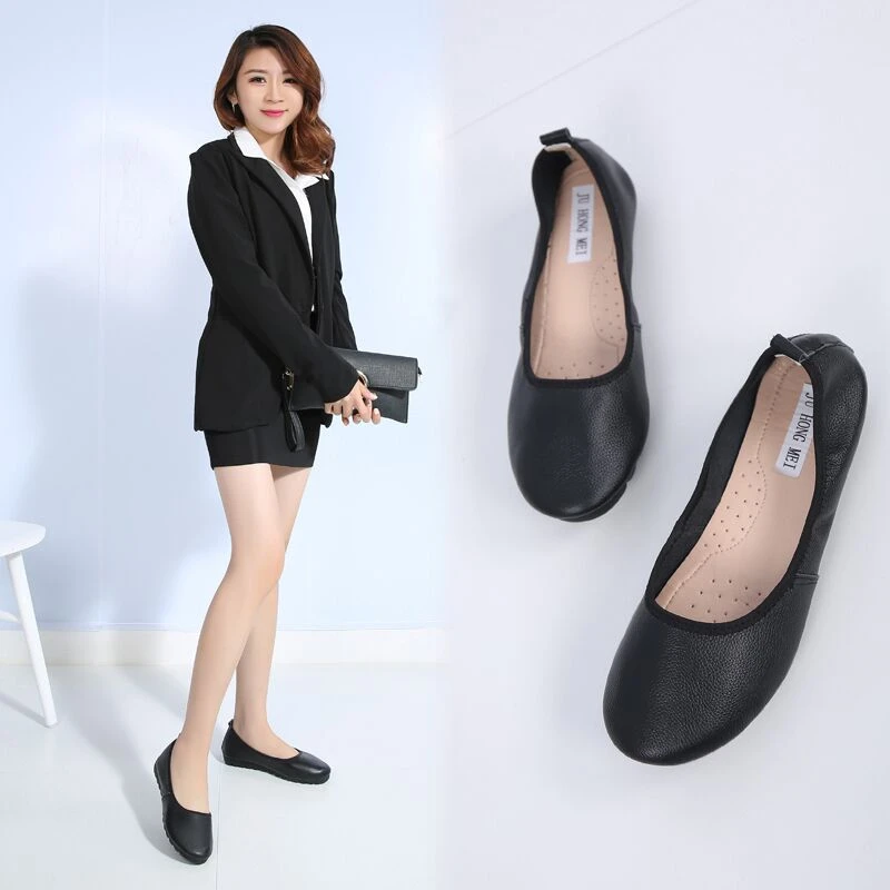 Cowhide work shoes women shallow round comfy loafers for work