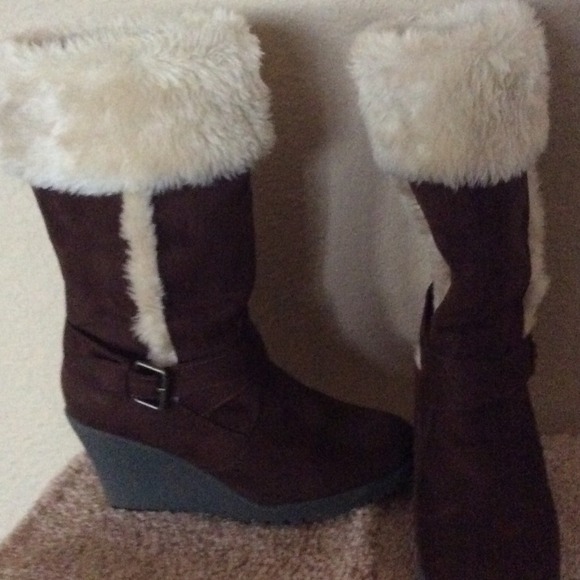 Brown Wedge Fur Top Boots Size 85 Pull payless fur boots