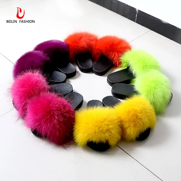 2020 Indoor Soft Pink Fox Fur Slippers pink fox fur slides