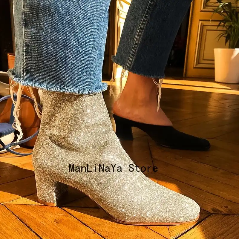 Zipper Round Toe Side Boots Women Bling shiny chunky boots